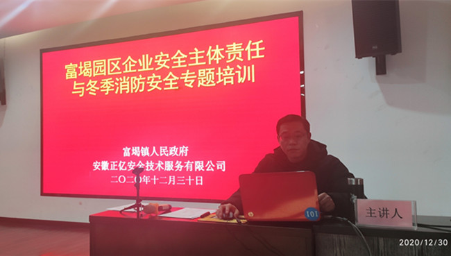 2020年12月30日,以“企業安全主體責任與冬季消防安全”為主題的富堨園區企業安全生產管理培訓在歙縣招商投資服務中心順利舉行。培訓由我中心下屬機構——安徽正億安全技術服務有限公司注冊安全工程師吳智勇主講,富堨園區21家重點企業的負責人或車間主任、安全員等20余人參加培訓。