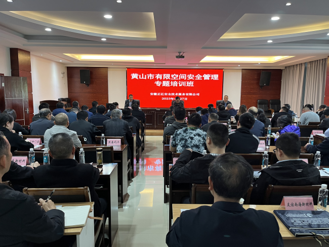 2023年4月27日,全市工貿行業(有限空間作業)安全管理專題培訓班順利開班。本次培訓由安徽正億安全技術服務有限公司承辦,全市工貿行業涉及有限空間作業的企業近80家共110名學員參加。黃山市應急管理局副局長吳永杰出席開班儀式并做重要講話,歙縣應急局張衛國局長主持會議。屯溪區、徽州區、祁門縣、黟縣、市高新區等區縣應急管理局領導專程帶隊參加培訓。